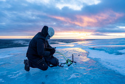 On two separate occasions I used hydrophones to record ice with drop rigs. In Iceland I captured the sounds of the glacier Vatnajokull calving and crashing into a frozen lagoon, in extremely slow motion. In a sub-zero Gobi desert landscape I recorded the sounds of a frozen lake that sang overnight.
