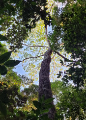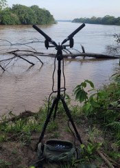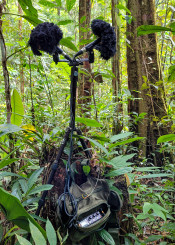 After settling into my campsite, I unpacked and set up my audio recording gear, then started to look for the ideal recording location using a DIY microphone holder attached to a tripod. I chose positions far enough from my camp to not pick up my own noises, but close enough to not lose them in this maze of vegetation. In the late afternoon, I hit record for the first time. By then, the rainforest was starting to get very active. I left the rig and slept in my hammock, leaving the microphones recording all night.