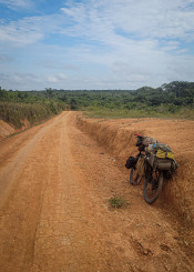 Finding a way into the rainforest was much harder than expected: a maze of dirt roads each led in a different direction or stopped at some house. Eventually, I reached the final finca (ranch) on the edge of the last deforested area. Someone was at home, and was astonished to see a foreigner; this woman gave me some of the sugary water she was boiling (aqua panela). I thanked her and continued, following cattle paths. Before reaching the rainforest proper, I hid my bike in a bush and after repacking my equipment into a backpack, continued on foot for the rest of the way. In this area, only a few water channels and patches of forest remain in the once-pristine jungle.